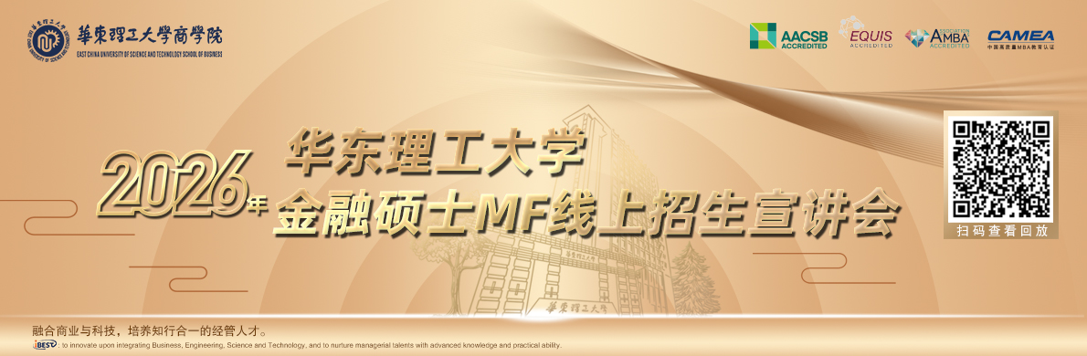 项目新闻 更多... 学生邀请函 | 职引・鹏程 华东理工大学... 27MF&MIB招生咨询面对面活动 2026-04-22 学生邀请函 | 职引・鹏程 华东理工大学... 2026-04-22 27MF&MIB招生咨询面对面活动 2026-04-21 2026年度华理商学院知行课堂 | 走进... 2026-04-20 钱旭红院士做客商院名家讲坛 暨“知行合一... 2026-04-16 「破界・见未来」iBEST 知行研学营:... 2026-04-03 商学院召开专业学位硕士培养方案修订专家论...