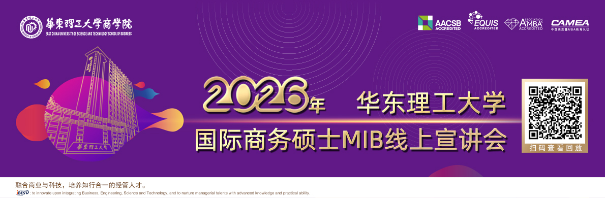MIB招生信息 更多... 2026-03-22华东理工大学国际商务硕士2026年入学复... 2026-02-27关于2026年全国硕士研究生招生考试初试... 2025-12-18重要提醒!请考生务必注意 2025-12-15【研招快讯】华东理工大学关于2026年全...